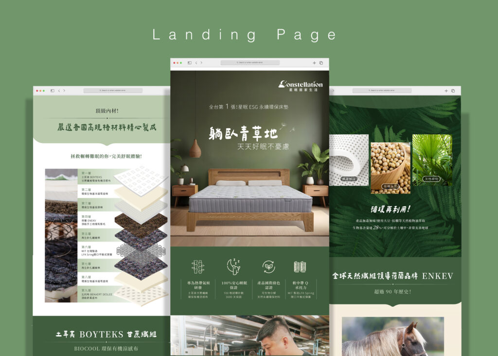 這次在製作銷售頁時,我們第一個思考的便是如何將這些友善環境的材質,用淺顯易懂的方式讓消費者可以一眼就懂。並將資料統整幫助閱讀、優化閱讀動線。消除一般對於環保材料不舒適、不耐用的疑慮,進而考慮購買。