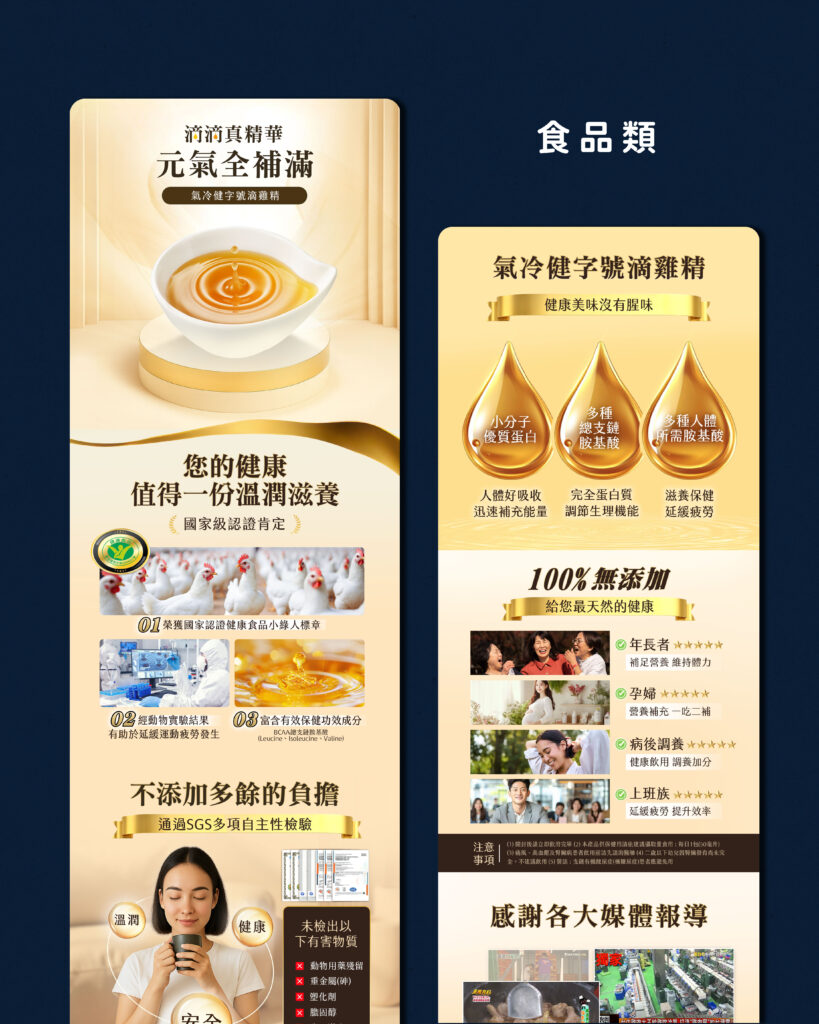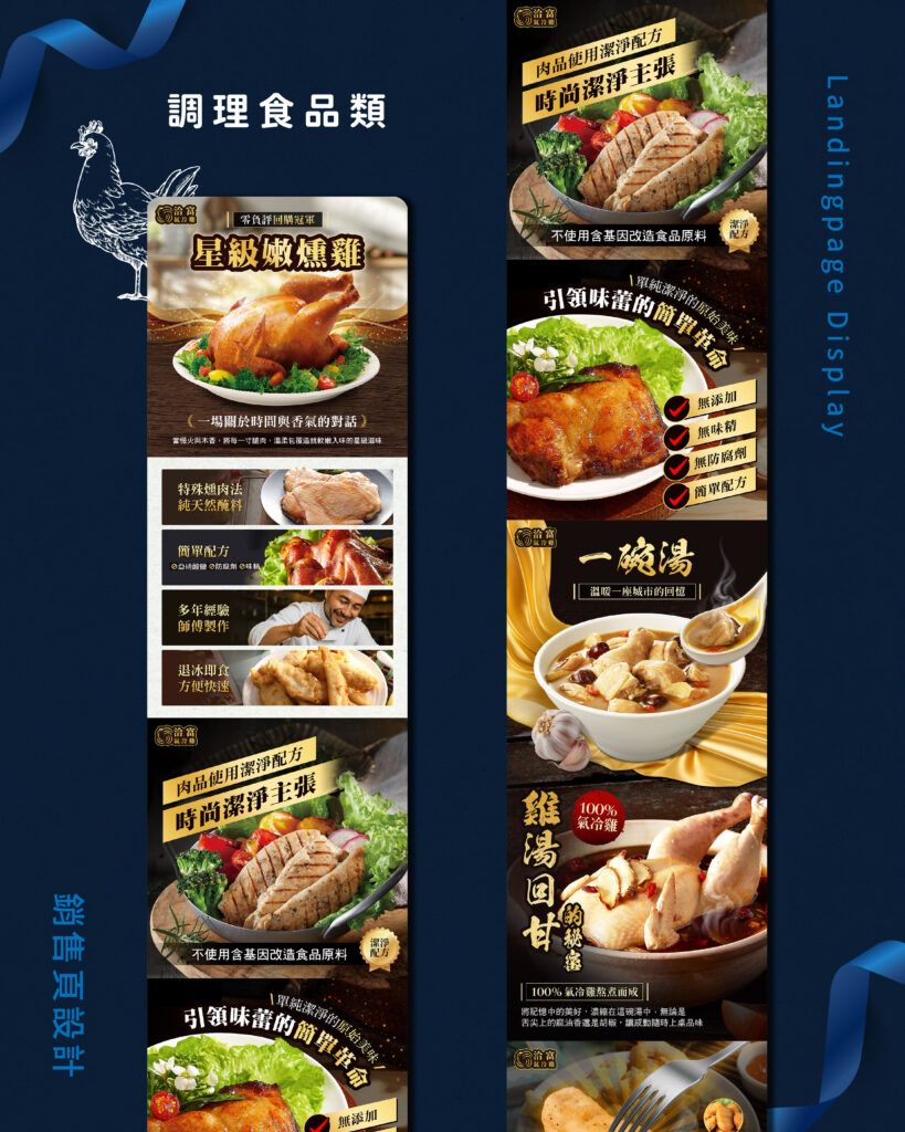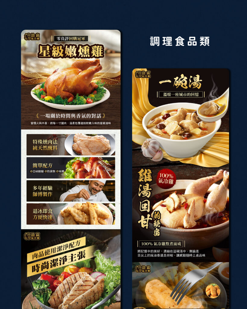先為人氣商品「氣冷生鮮肉品」、「舒肥雞胸」、「氣冷滴雞精」、「調理食品」定調設計語言,再將詳細的產品資訊轉化為直覺易懂的圖像語言,讓消費者能一眼理解差異、快速建立信任。