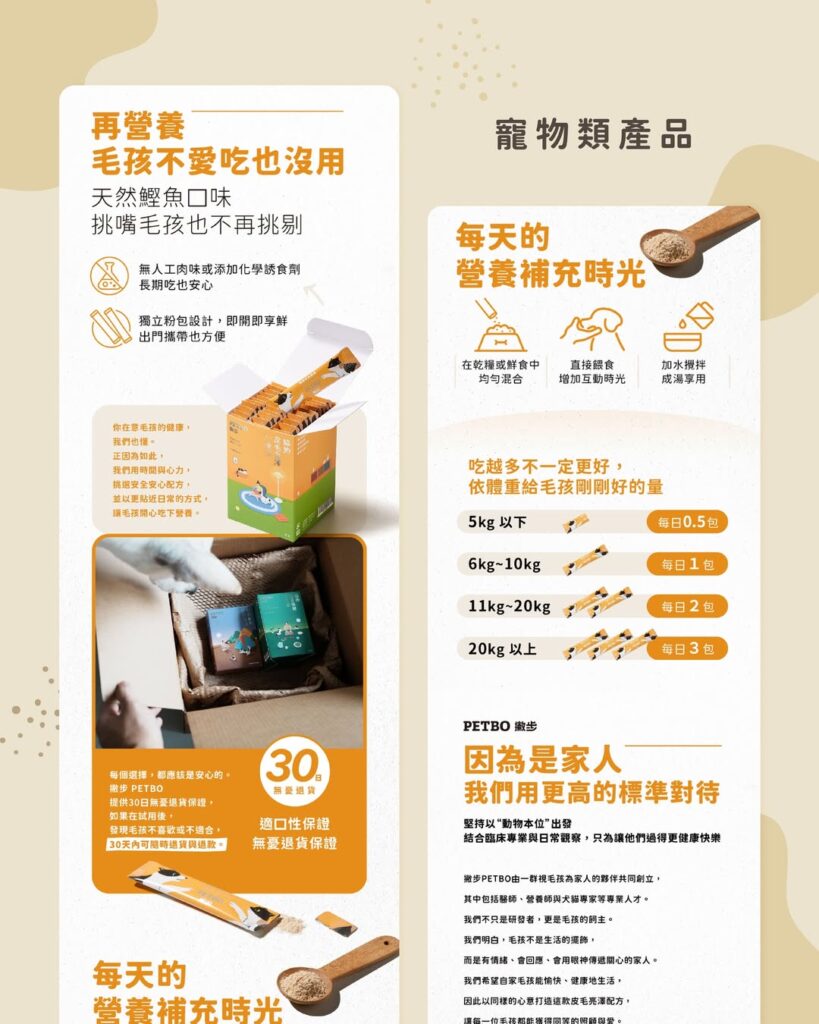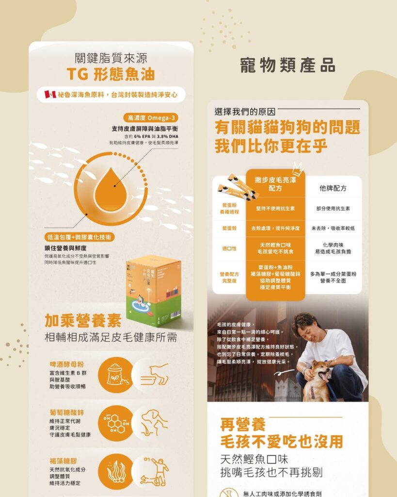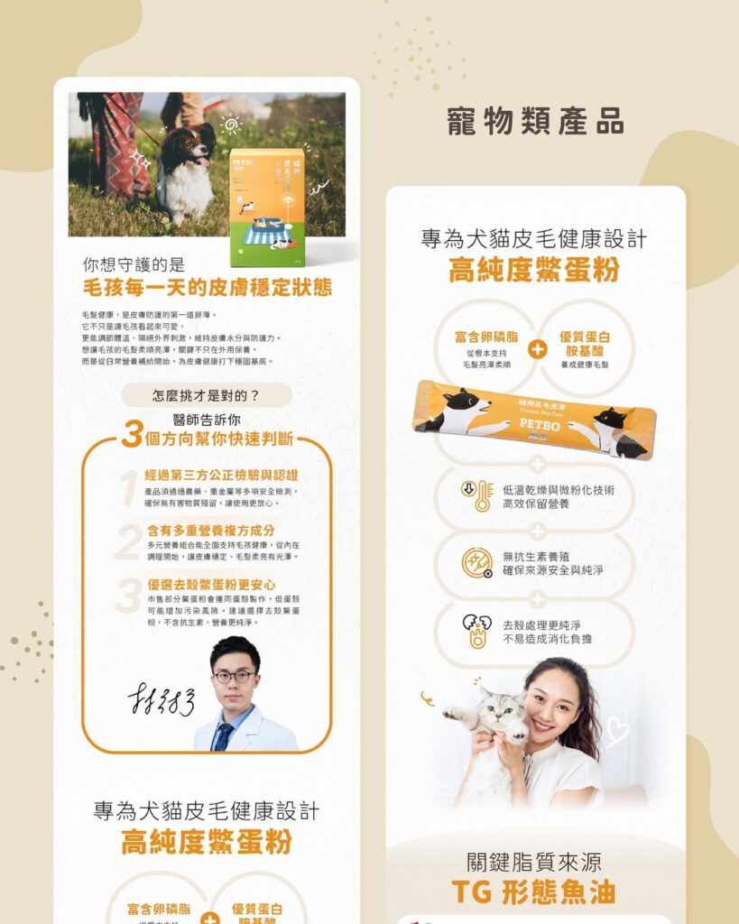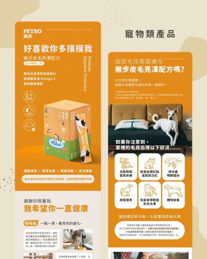 寵物保健品銷售頁設計|繼上次分享完 PETBO 撇步的【貓狗腸胃益生菌】與【貓狗專用魚油】,今天要介紹另一個明確定位的銷售頁產品:【皮毛亮澤配方】。